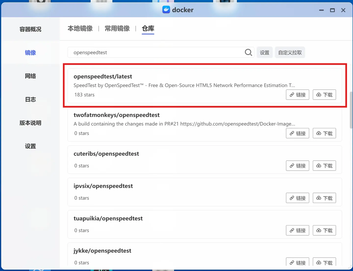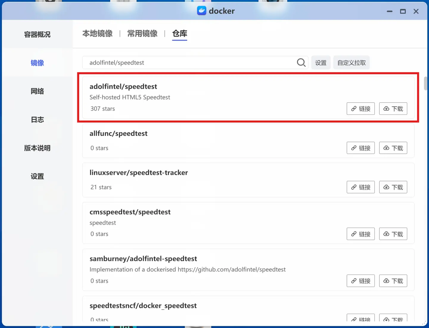 在docker镜像里面找到 adolfintel/speedtest ,下载后,再添加到容器。