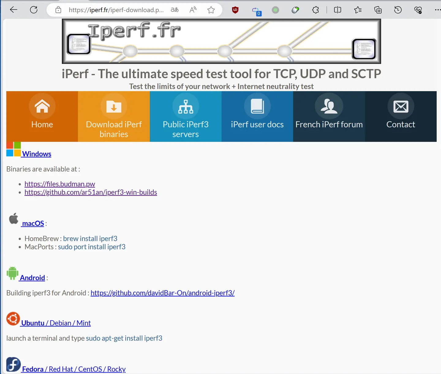 在电脑上我们需要下载 iperf3 的程序,根据你的系统来下载。官网:https://iperf.fr